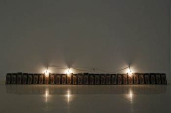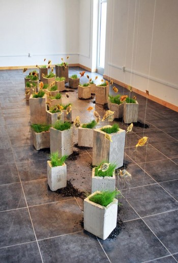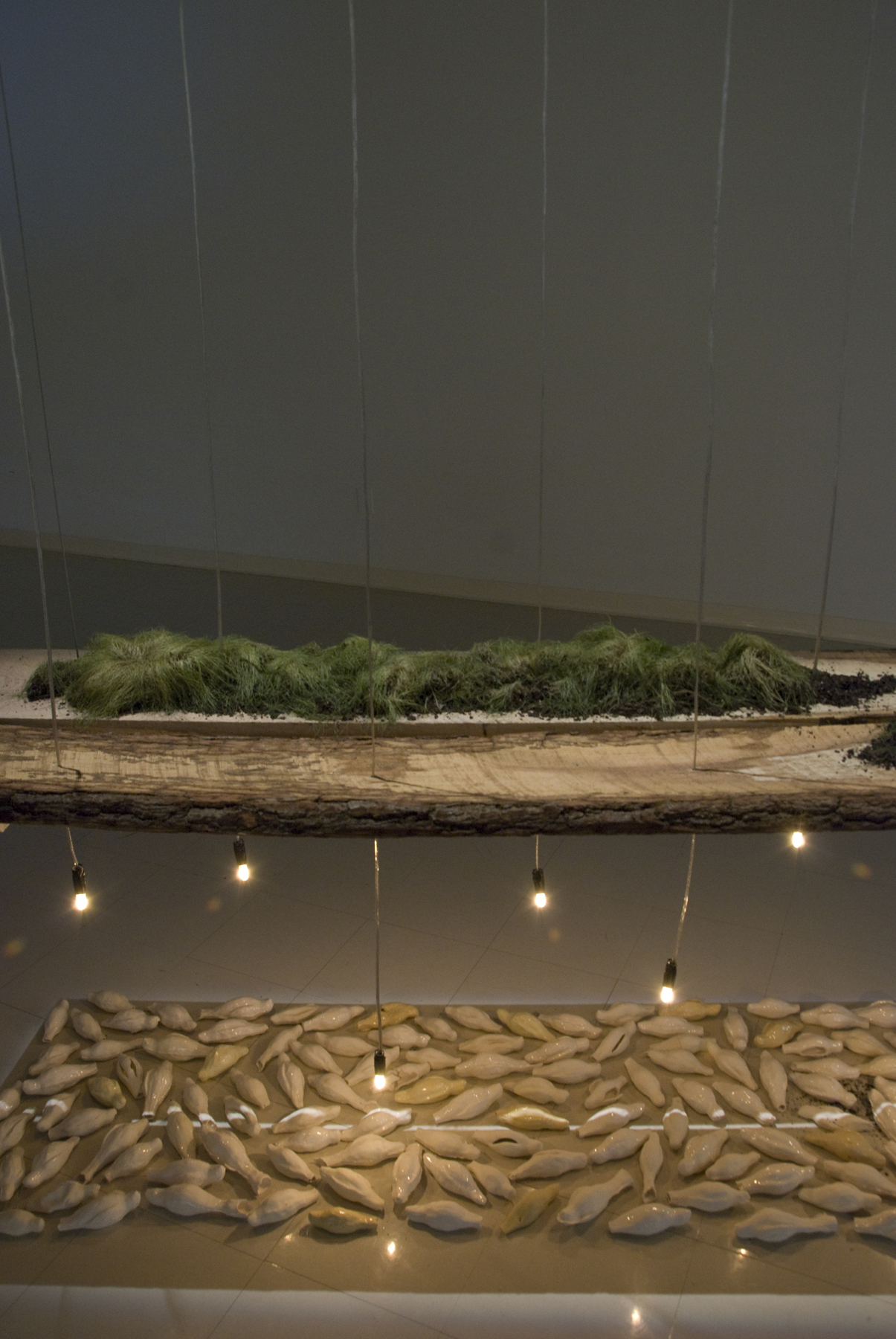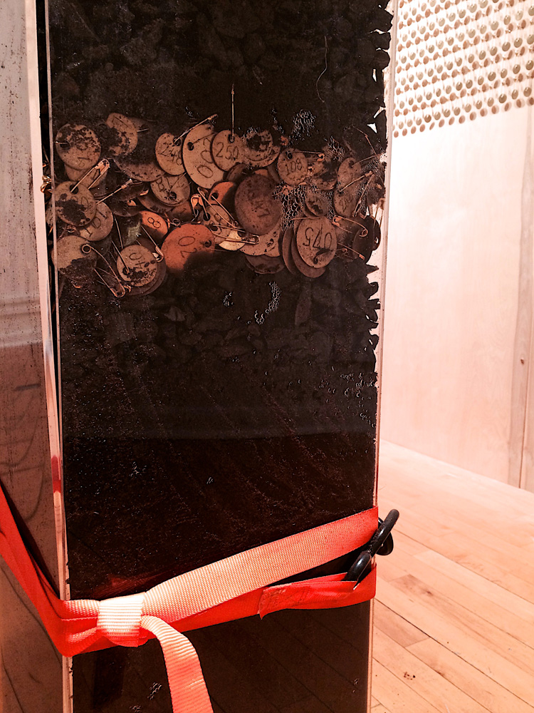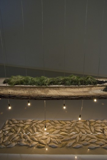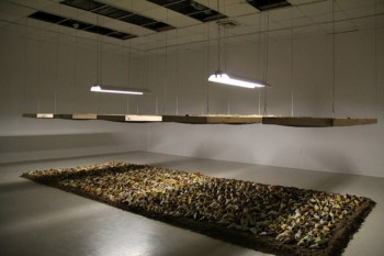Seven Hundred Thirty-Five, dimensions variable, fabric, anthracite coal, soil, wood, sod, wire, fluorescent lighting, 2011.