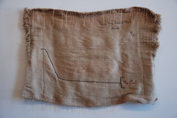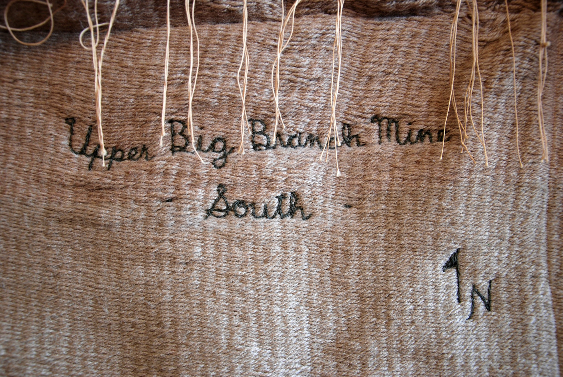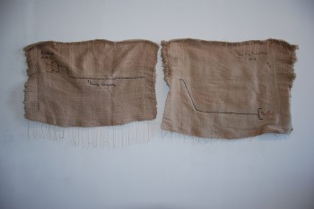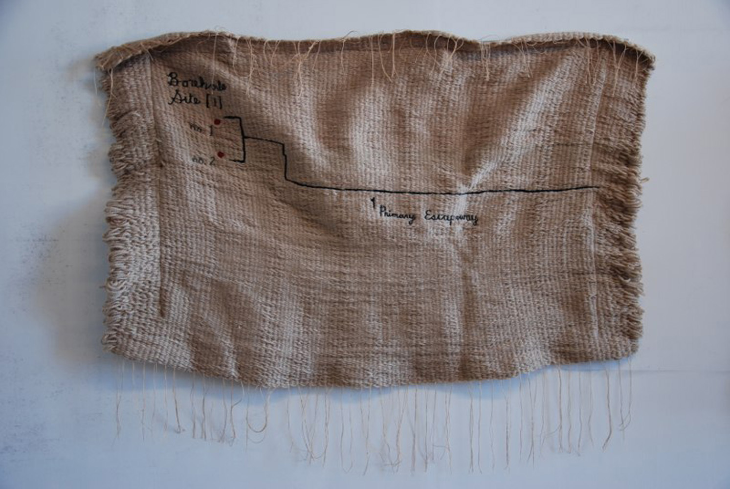 No Exit, handwoven with hand embroidery, each 32 x 40", 2012-13. A handwoven and embroidered schematic of the passage way any surviving miners would have followed to exit the Upper Big Branch Mine. Also shown are the two bore holes drilled to search and rescue miners based on their last known location. 29 miners were killed in the explosion, 2 survived.